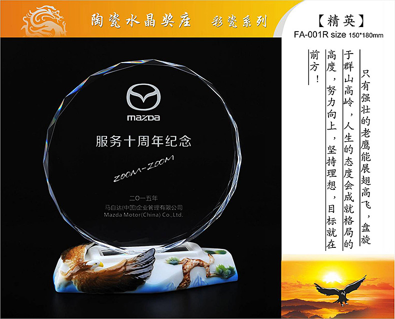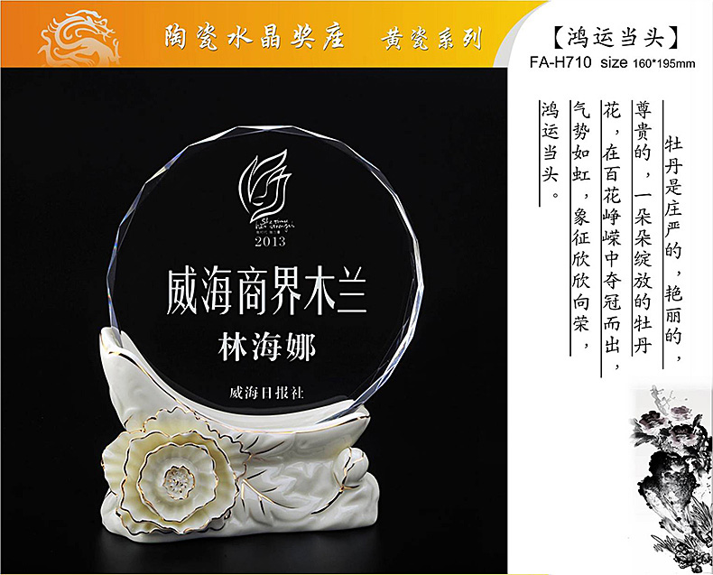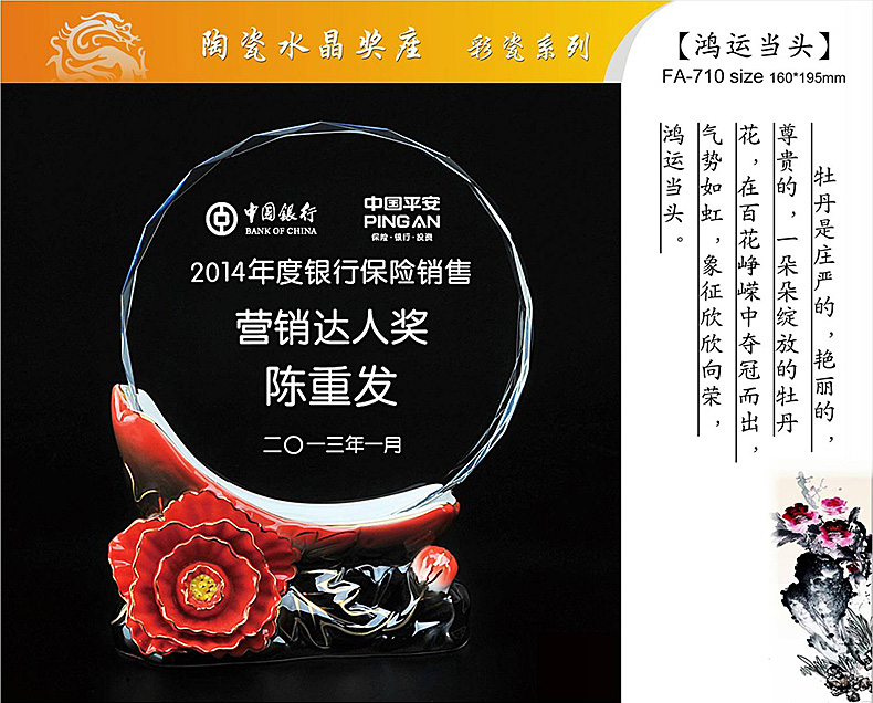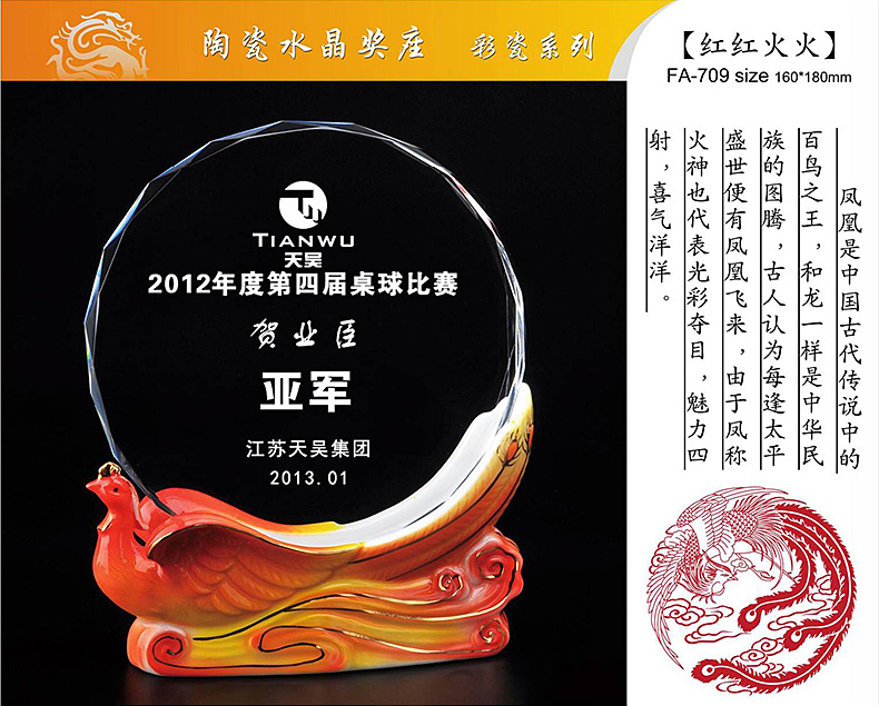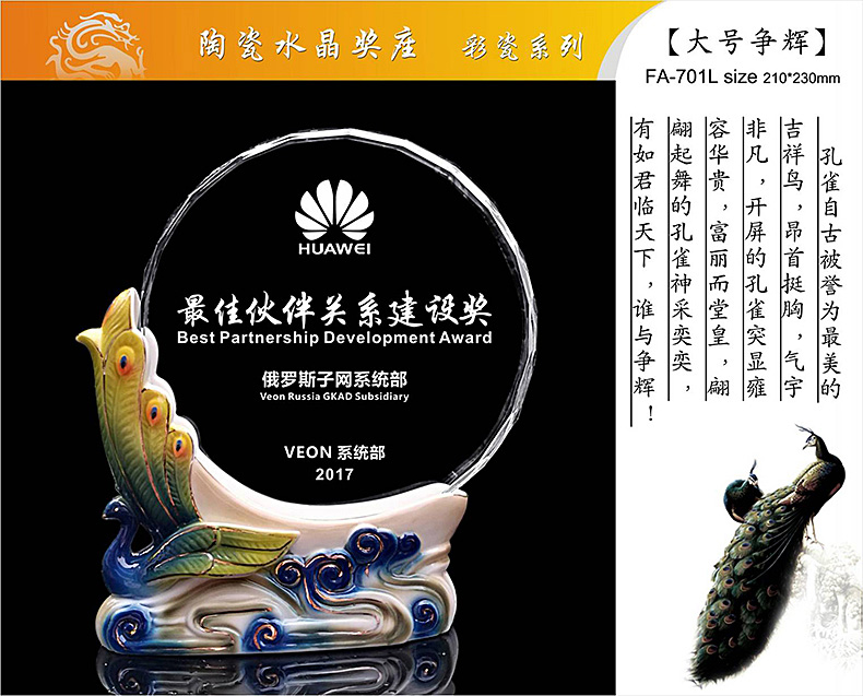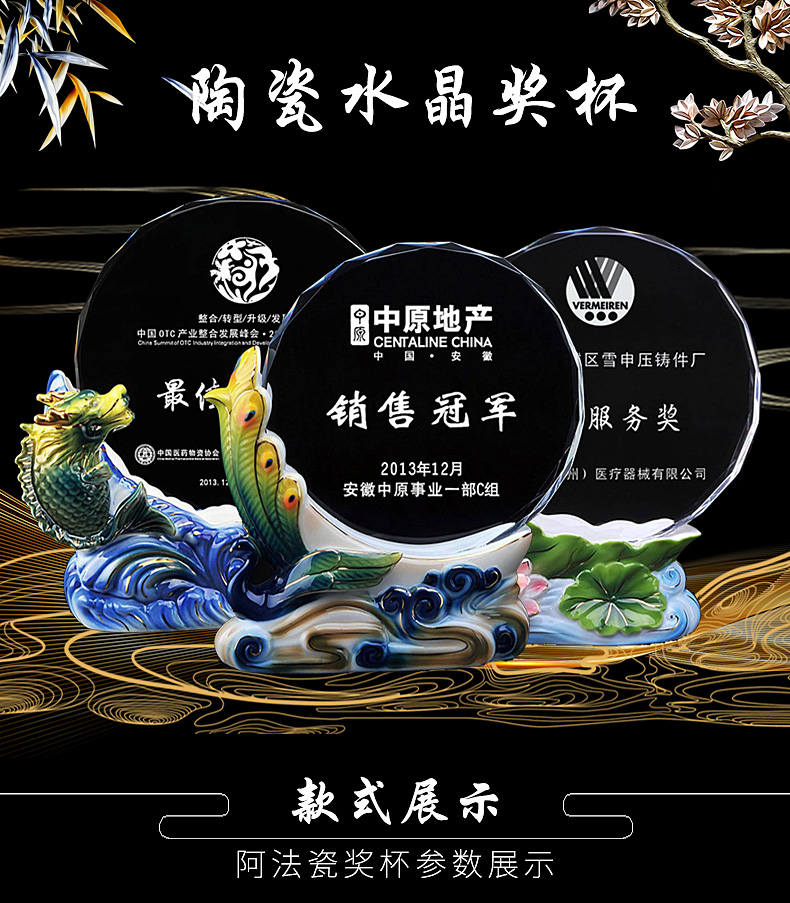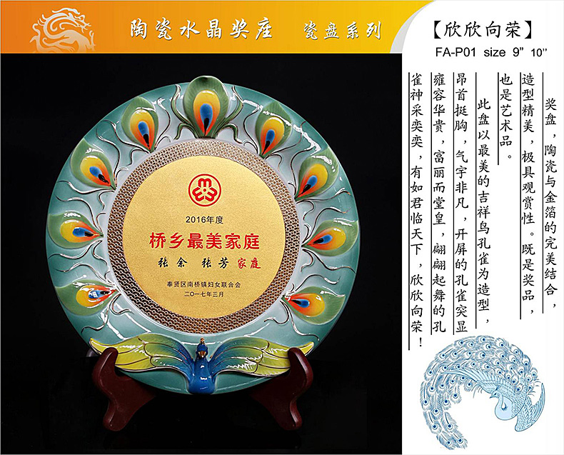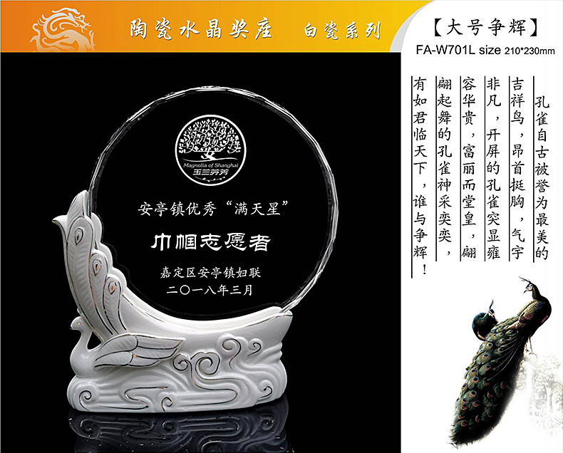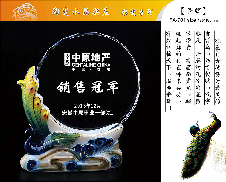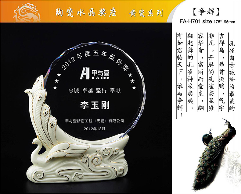 1001 / 水晶陶瓷奖杯定制创意奖牌周年庆古典孔雀感谢奖牌定做授权加盟牌